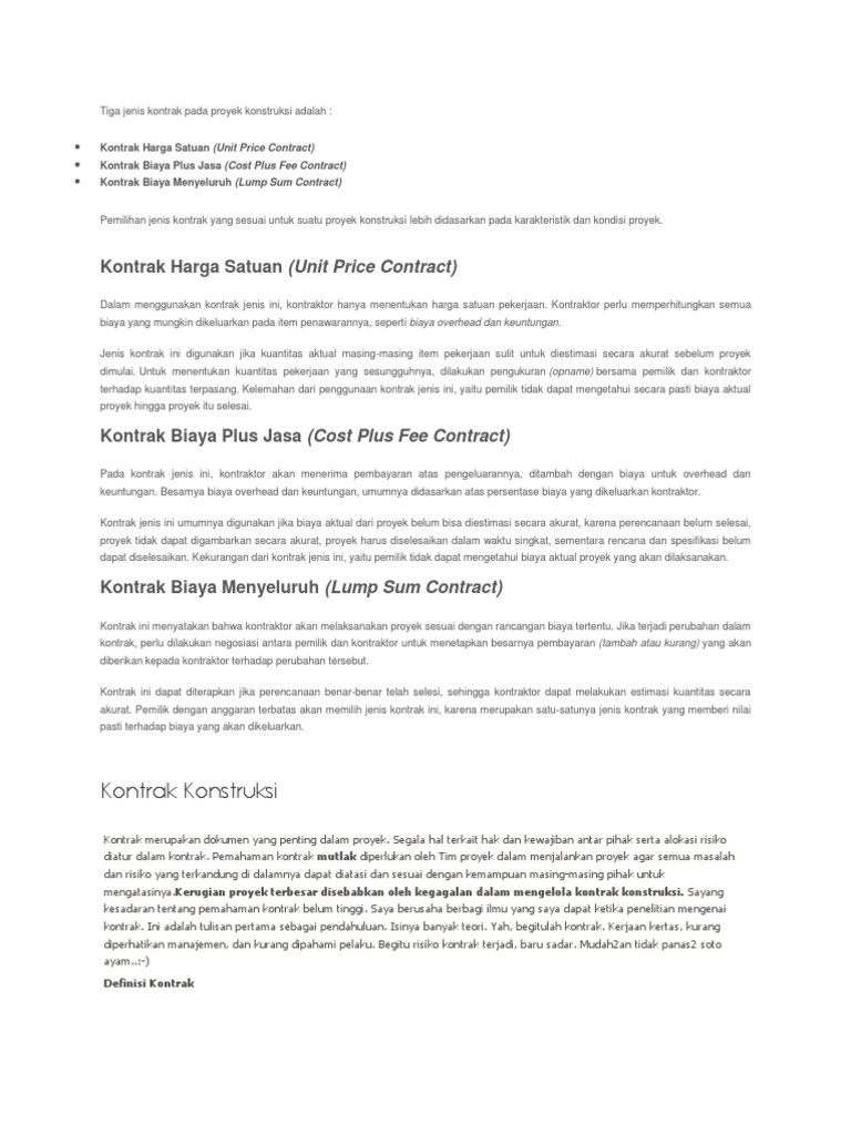 16, 2012 31,714 views leo agus follow recommended. Selaku perencana rancang bangun bangunan di jl. Sedangkan untuk kontrak pengadaan jasa konsultan perencanaan bangunan gedung harus menggunakan kontrak lump sum karena volume hasil pekerjaan tersebut sudah pasti yaitu berupa sejumlah gambar desain bangunan yang dijilid sedemikian rupa. (b) rincian harga kontrak sesuai dengan rincian yang tercantum dalam penawaran biaya terkoreksi sesuai dengan berita acara hasil klarifikasi dan/atau negosiasi. 6.2 harga kontrak (a) harga yang dibayarkan atas prestasi pekerjaan dilakukan dengan bentuk mata uang dan nilai kontrak yang tercantum dalam surat perjanjian.